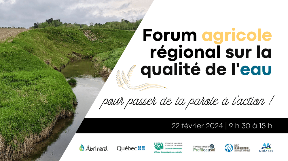Le premier forum a eu lieu le 22 février 2024 au Centre culturel Saint-Benoît à Mirabel. Sous la forme d’une série de panels, des experts des gouvernements, des municipalités et d’organismes de conservation ou environnementaux ont pu présenter aux producteurs les types de projets et aménagements qui peuvent être faits pour améliorer la qualité de l’eau et restaurer les milieux humides et hydriques. Des kiosques ont pu compléter l’offre d’information – et de services – aux participants.